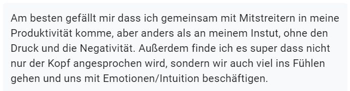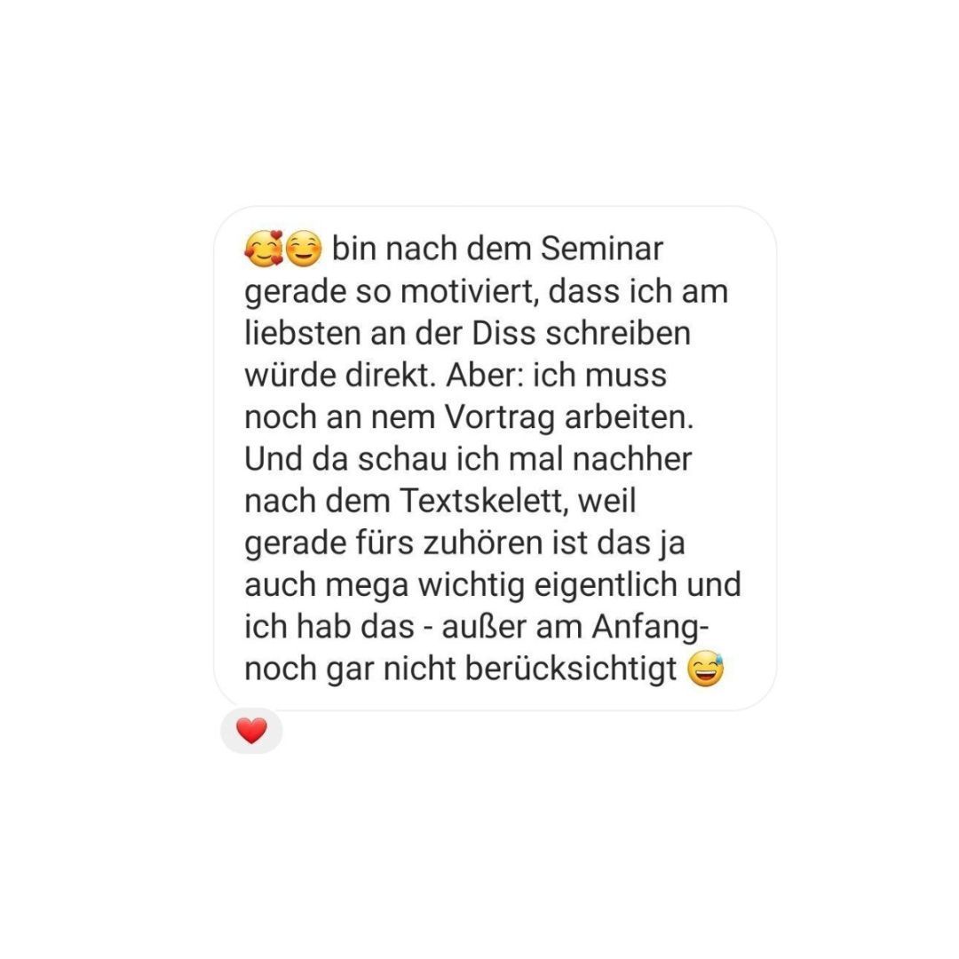 Nicht unerwähnt darf an dieser Stelle auch ihre empathische, wertschätzende und vertrauensvolle Art bleiben: Ich fühlte mich (und meine Arbeit) rundum gut aufgehoben.“
